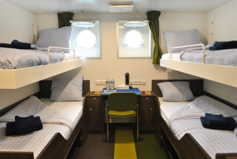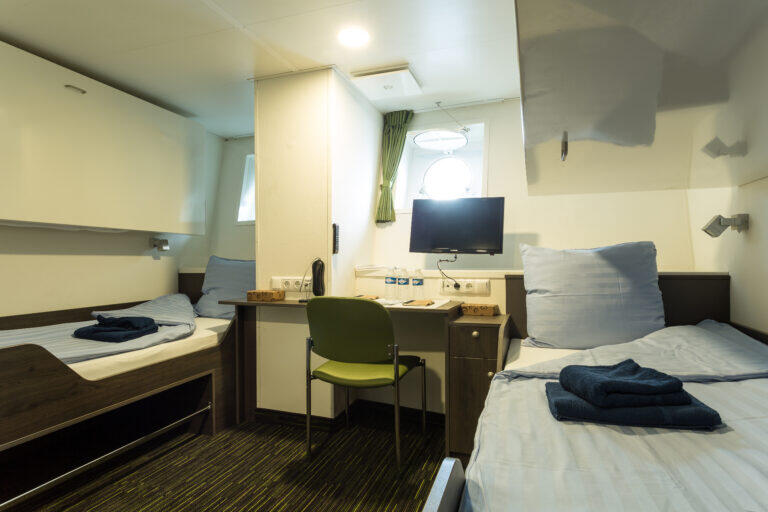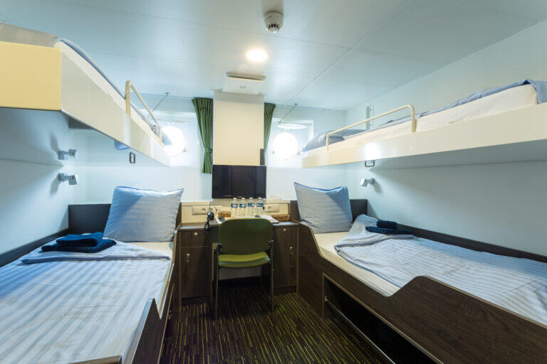 Statek posiada 57 przytulnych kabin i jest w stanie przyjąć na pokład 116-123 pasażerów. Posiada 4 kabiny czteroosobowe z bulajem, 2 kabiny trzyosobowe z bulajem, 27 kabin dwuosobowych z bulajem, 12 kabin z 2-ma łóżkami z oknem, 2 kabiny Deluxe z 2-ma łóżkami (15m²), 2 kabiny pojedyncze, 6 kabin Superior z 2- ma łóżkami (21m²). Wszystkie kabiny posiadają łazienki z prysznicem, stolik z krzesłem, telewizor LCD, telefon oraz dostęp do internetu, szafę oraz suszarkę do włosów.