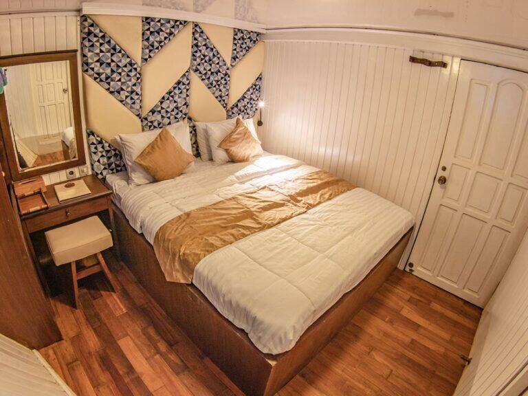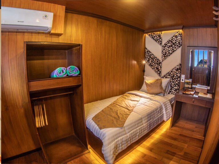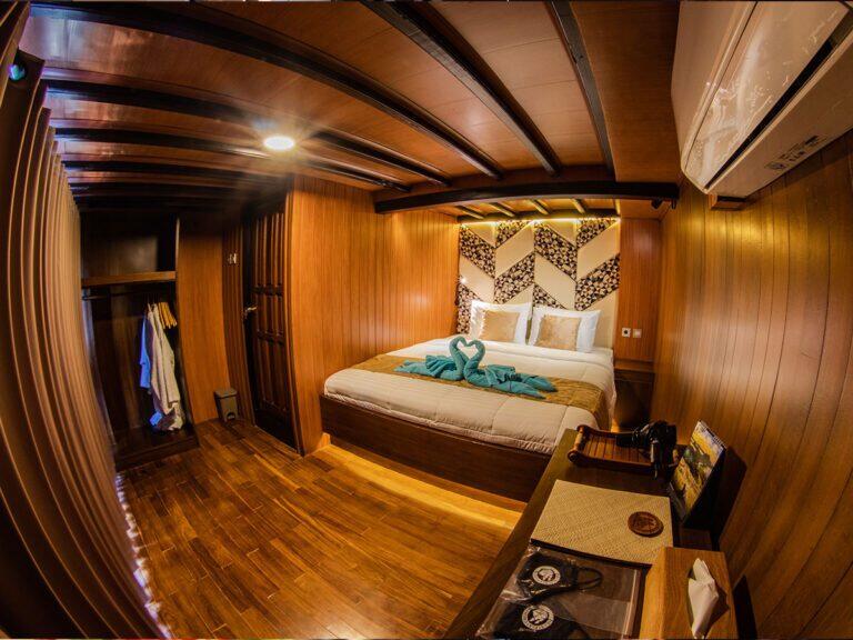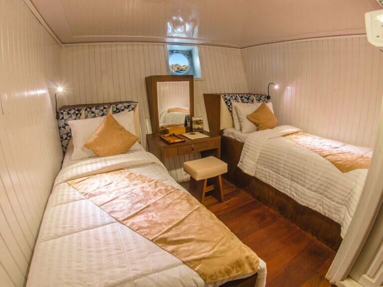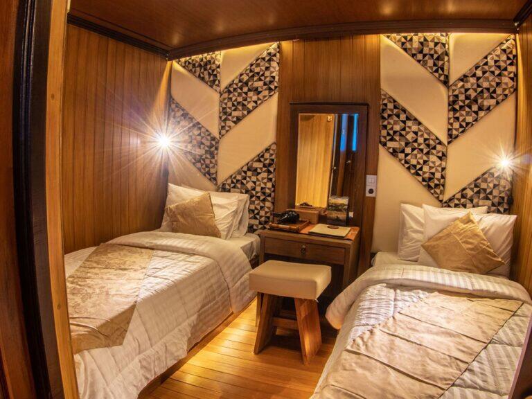Wszystkie komfortowe kabiny, które proponujemy podczas safari zostały zlokalizowane na głównym lub górnym pokładzie. Wyposażone są w okna, zapewniające mnóstwo naturalnego światła i piękne widoki. Kabiny posiadają klimatyzację oraz łazienkę z prysznicem. Dwie z nich mogą być wykorzystane do pojedynczego zakwaterowania. Trzy kabiny, na górnym pokładzie są idealnym wyborem dla par – posiadają przestronne łóżka małżeńskie. Na gości czekają ręcznik wraz z szlafrokiem, suszarka oraz kosmetyki do kąpieli.