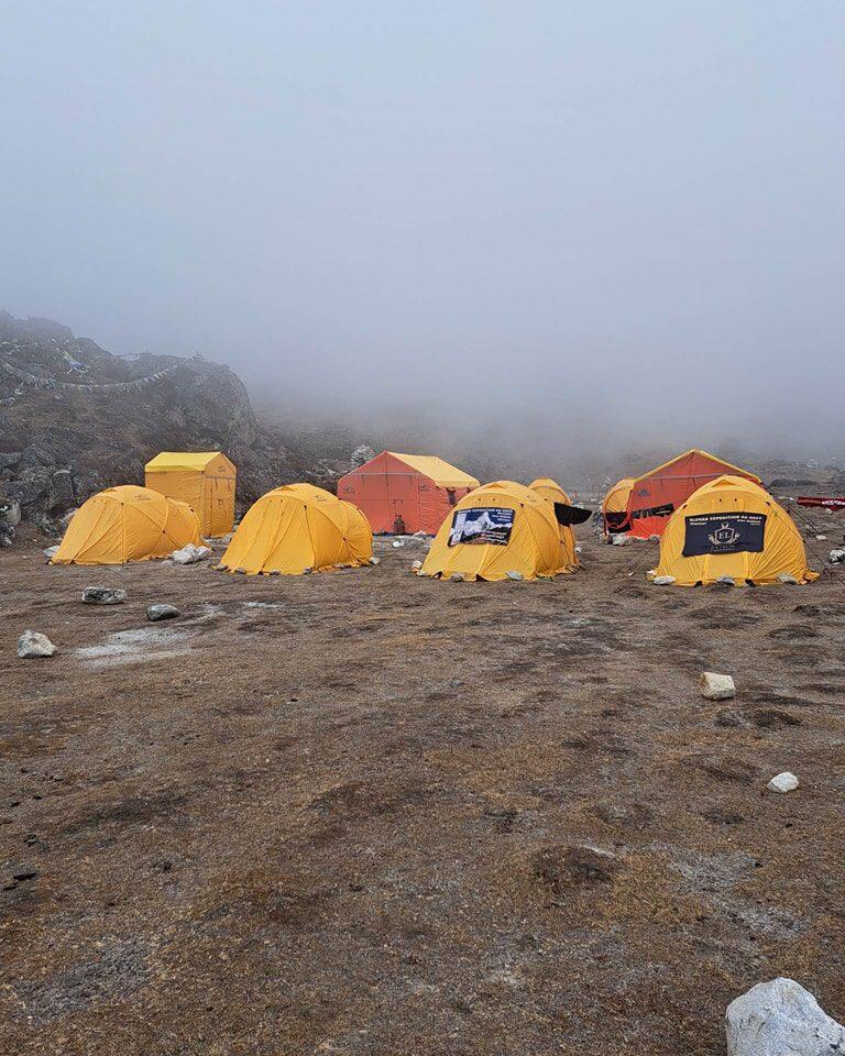 Przed nami jeszcze ok. 3 godziny marszu licznymi podejściami i zejściami. Widoki będą bajeczne, aż staniemy twarzą twarz z miejscem gdzie w żółtych namiotach, himalaiści z całego świata zaczyna swoją przygodę życia – to miejsce na swój trudny do opisania klimat – chociaż sam Mt. Everest na monet zniknie z nam z oczy,