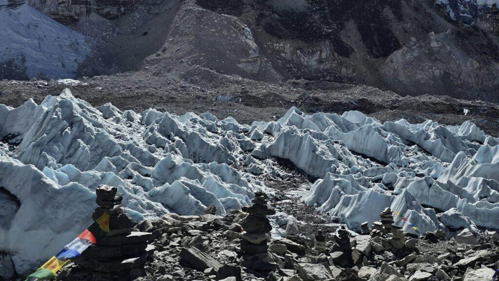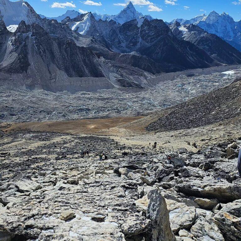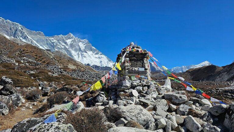 Po przeciwnej stronie lodowca będziemy mieli piękny widok na Nupse oraz śnieżnobiałe szczyty Pumori. Na szlaku miniemy również zbiorowo przyozdobione flagami modlitewnymi czorteny upamiętniające śmierć wspinaczy himalajskich, na szczytach otaczających lodowiec Khumbu.. Jest to niezwykłe miejsce robiące wielkie wrażenie,